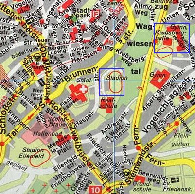 Krebsberghalle Fernstraße TuS-Halle 4 Haspelstraße Beide Hallen sind über den Krebsbergweg durchs Wagwiesental in knapp 5 min auch zu Fuß erreichbar. |